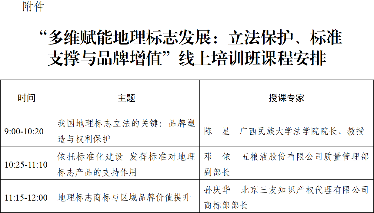 附件:“多维赋能地理标志发展:立法保护、标准支撑与品牌增值”线上培训班课程安排