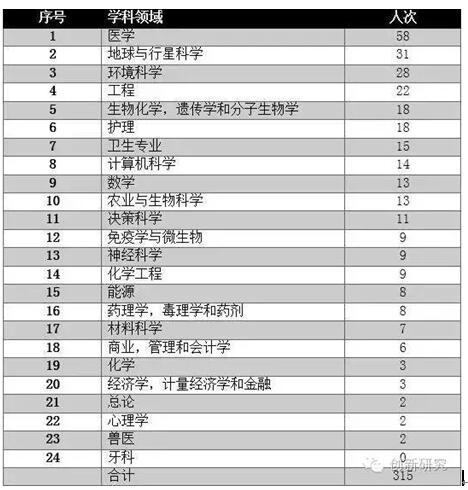 从学科领域的分布情况来看,289名学者(315人次)基本覆盖了24个学科大类,259个二级学科小类。从学科领域大类来看,任职学者人数超过10人次的学科领域包括医学、地球与行星科学、环境科学、工程学、生物化学遗传学和分子生物学、护理、卫生、计算机、数学、农业与生物科学、决策科学(见表1)。