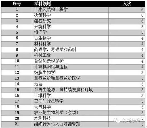 从二级学科领域来看,任职学者人数在4人次以上的学科领域包括:土木及结构工程学、决策科学、癌症研究、环境科学、海洋学、古生物学、材料科学、药理学毒理学和药剂、机械工程、自然和景观保护、计算机网络与通信(见表2)。