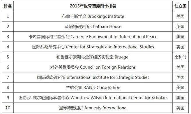 2015美国排名前十智库
