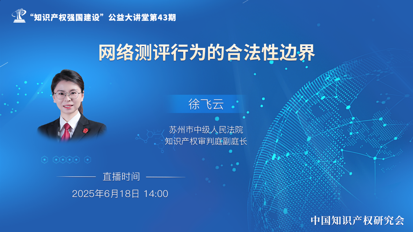 中国知识产权研究会“知识产权强国建设”公益大讲堂第43期将于6月18日(星期三)下午14:00开讲,主讲人是苏州市中级人民法院知识产权审判庭副庭长徐飞云,主题为“网络测评行为的合法性边界”,欢迎大家届时观看。具体观看方式如下: